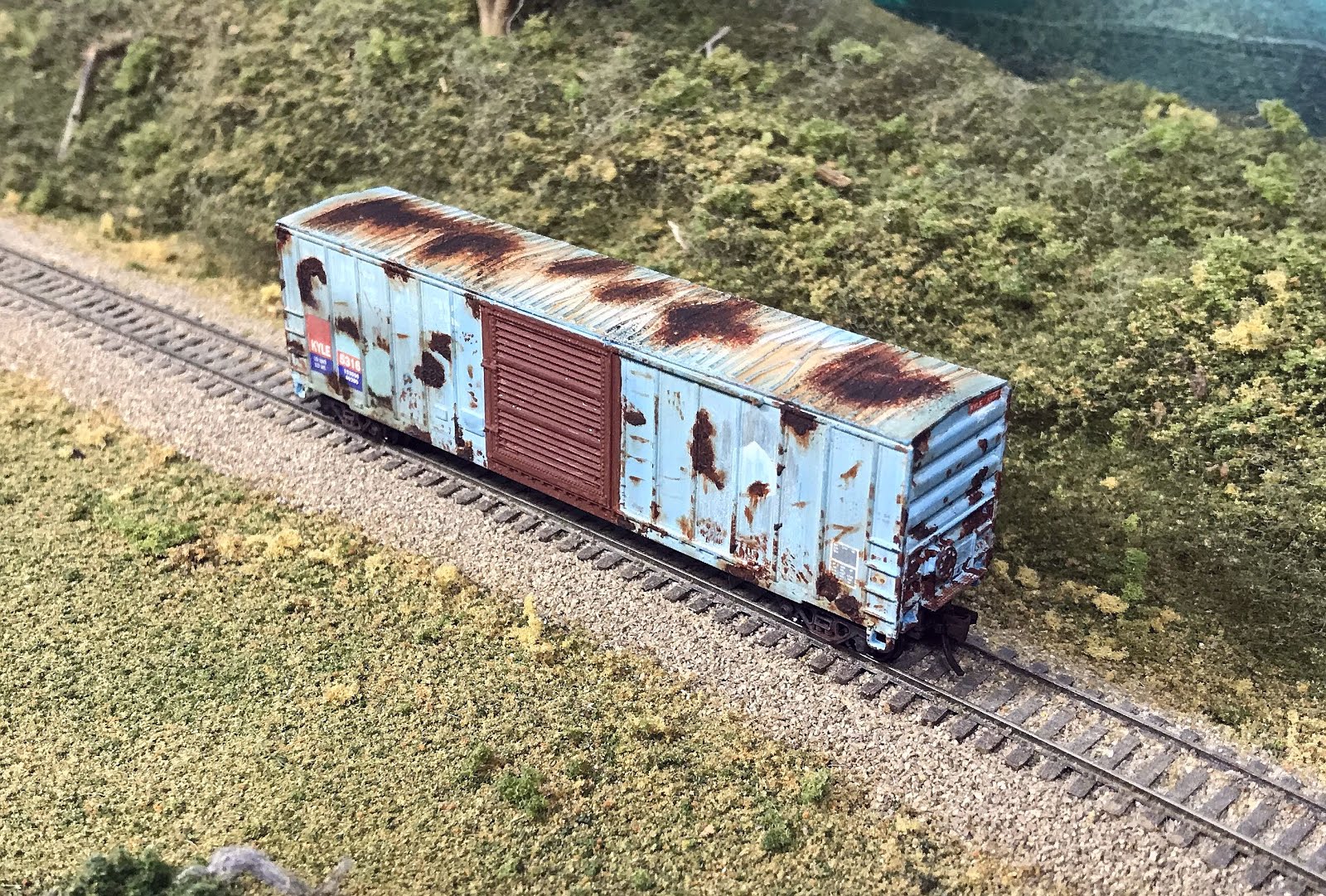 Allen rusted up a Rock Island boxcar for me and patched it for the Kyle Railroad; I often see these cars here in Denver and it wasn't a stretch to say they could end up on the layout in Arizona.